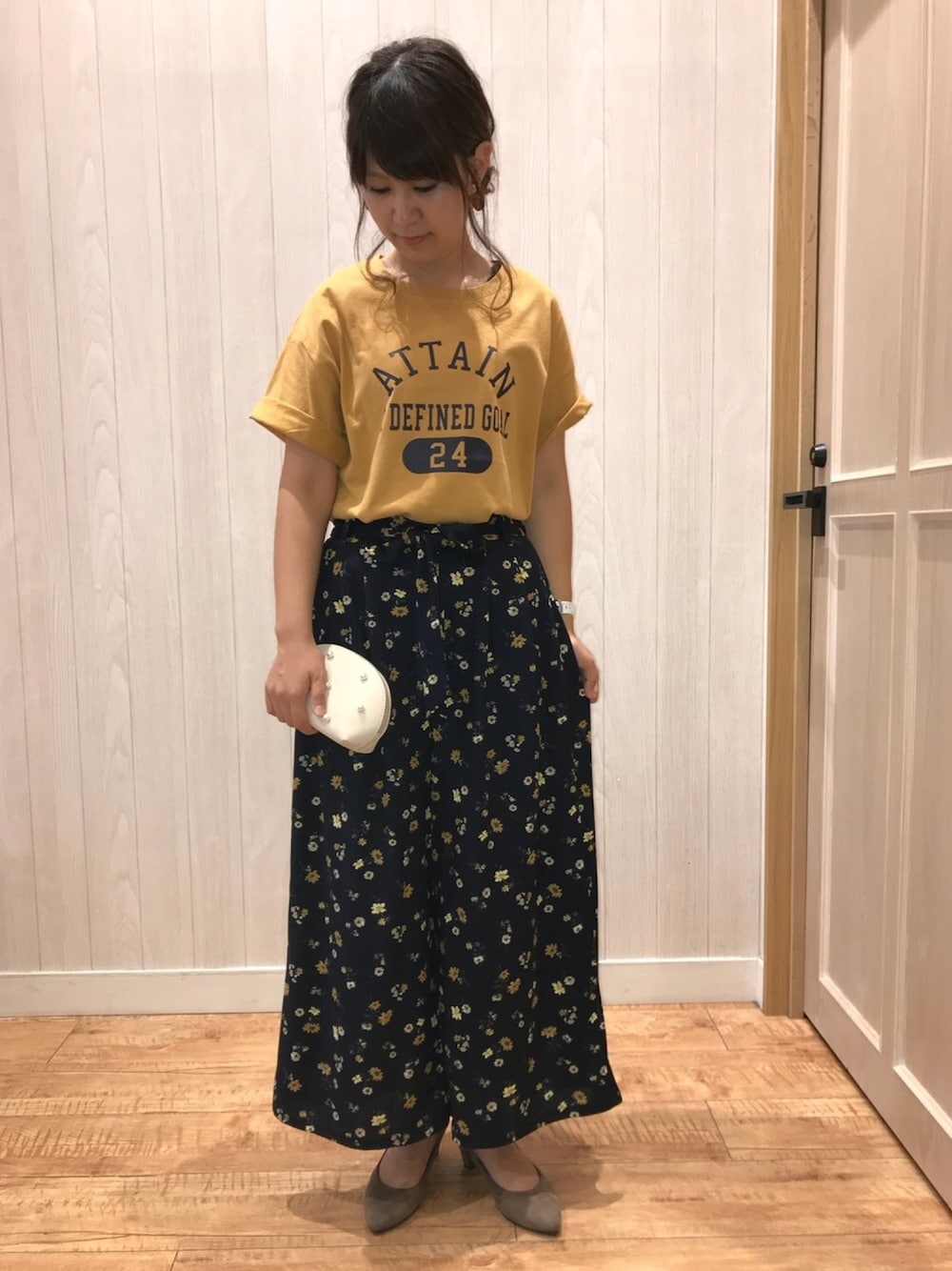 こんにちは* 大阪帰省から 戻ってきました。 帰りは息子と2人で 初めての新幹線だったので どうなるかヒヤヒヤもんでしたが お利口さんでいてくれて 助かりました😂 迎えに来てくれた こっちのじーじに 「飴ちゃん、美味しいで!」 と言っていて 完全に大阪に染まってきました😅 お休みありがとうございました☺️✨ コーデです。 新作のロゴTは 微起毛素材で滑らかな肌触りで とても着心地が良いです👌 このカラーも 秋らしくて好きです🍁 花柄スカンツも新作です。 ペタンコで合わせたいところを パンプスにして カジュアルになりすぎないようにしました。 バッグは合うものが思い付かず ポーチ👝💦 パールが付いていて お洒落なポーチです♡