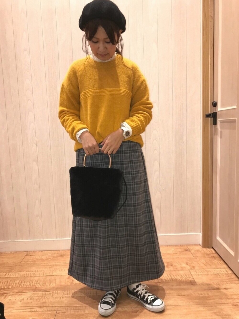 こんにちは* 今日はキューティーコーデ🐰♡ フェザーとモールヤーンの切替ニットと チェックスカート合わせ✨ ニットのデザインがすごく可愛いくて😍 秋冬に着る明るい色って 新鮮でいいですよね😊 インナーにはレーストップスを着て さらにはスカートコーデだったので スニーカーでカジュアルダウン👟♡