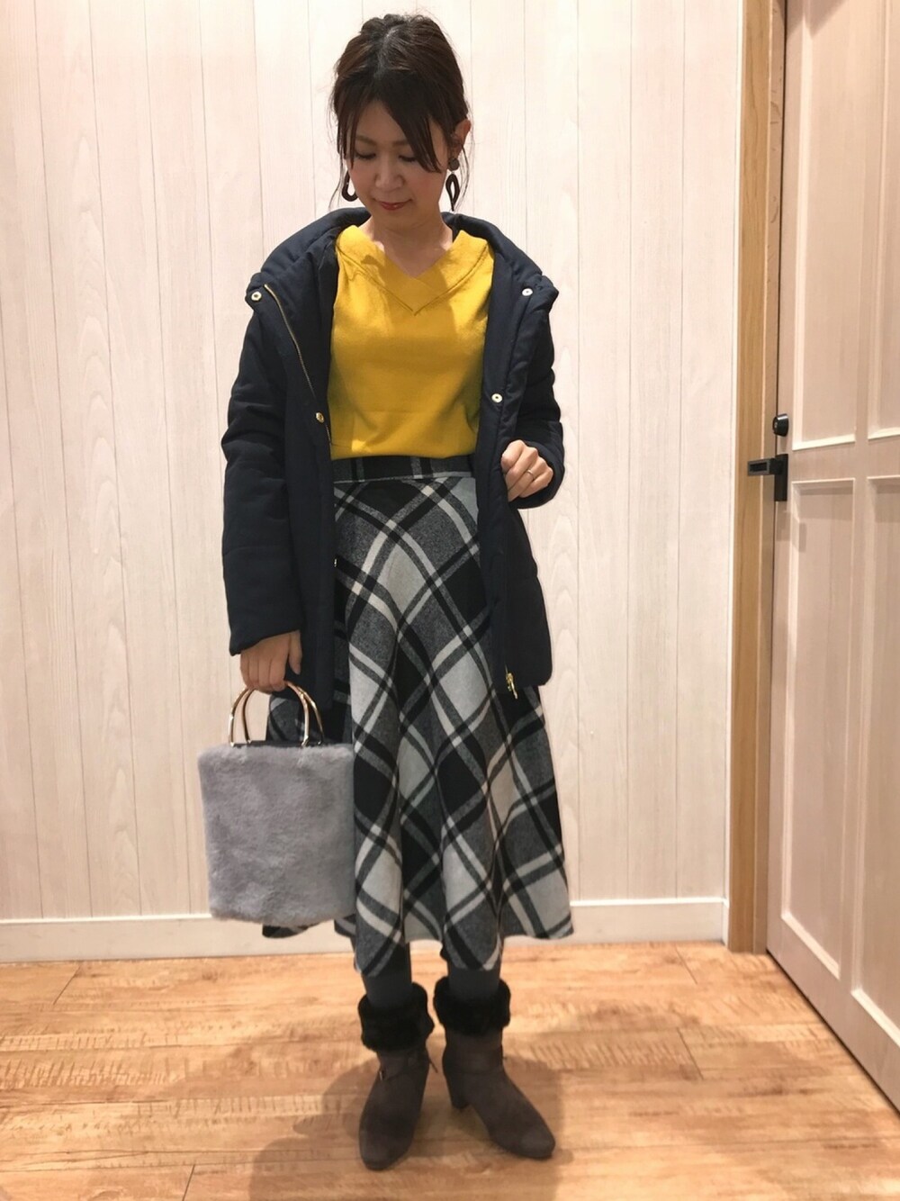 こんにちは* 今日はちょっとガーリーな コーデをしてみました☺️💄 普段は絶対着ないようなコーデです💦 中綿アウターは絶妙な丈感が パンツにもスカートにも合って◎です🙆♀️ アウターの中は イエローニット♡ カラーニットは 暗くなりがちな冬にオススメです✨