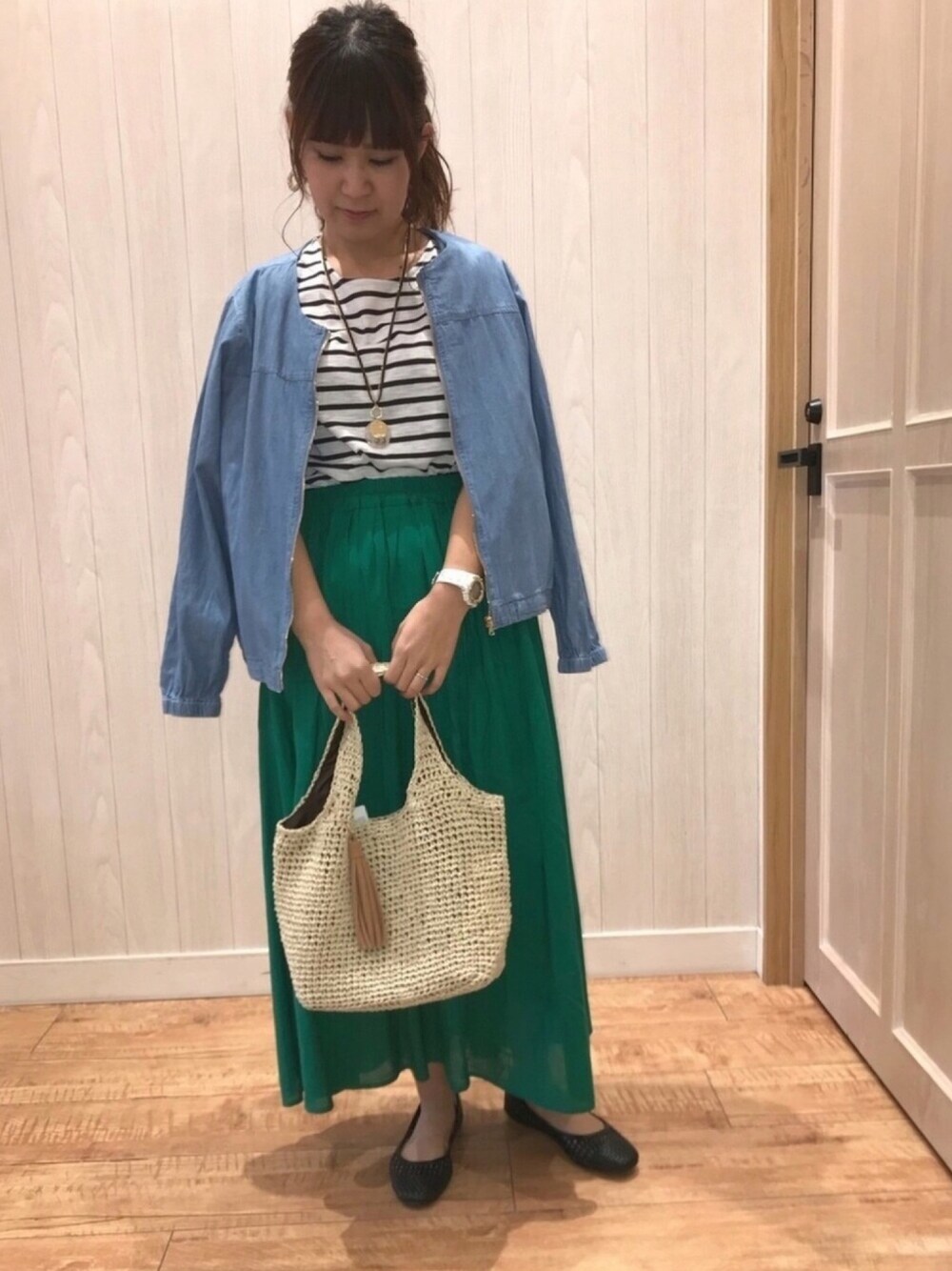 こんにちは* お店のスタッフ全員+上司とで、 今まで頑張ってきたことの発表を1人ずつして、 さらにそれに対しての反省会?を 数日にかけてやります、という スケジュールを言い渡されて ガビーンとなる夢を見ました。 起きた時、あぁ夢で良かったと 心底思いました。← なんでこんな夢見たんだろ?🙄 今日のコーデは グリーンのスカートが主役✨✨ 色合いといい、生地感といい、 長さといい、全て可愛い!💕 コットンにレーヨンも入ってるので なめらかな風合いです♬ これからの春夏に大活躍しそうです☀️ トップスはまだ早いですが、 五分袖の下シャツ👚 袖と裾の刺繍が凝っていて可愛いのに、 お値段¥2158です! アウターなしの写真も載せたんですが、 刺繍分かりづらいですね💦 ぜひ商品ページご覧下さい☺️