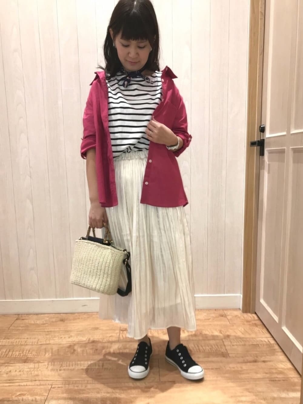 こんにちは* ずっと通勤用のトートバッグを 探しているんですが、なかなか見つかりません😩 "肩にかけられる長さの持ち手" っていうのは譲れないポイントで、 プラスちょっと大きめサイズで さらに可愛いデザインが良い! 可愛いと思っても持ち手短かったり、 持ち手長くてもサイズが小さかったり、 あとデザインが微妙だったり😓 けどこういう風に、 見つけてる時間もそれはそれで楽しいんですよね♬ 今日のコーデは 人気のリネンシャツを羽織ってみました👚 鮮やかな濃いピンクなので、 他をベーシックカラーにしました。 撮ってみてから、 バッグも濃い締め色にしめば良かったな、と後悔💦 あと髪もアップにした方が良かった💦 このカラーだったら、 元気にお団子ヘアとか合いそうですね☺️☀️