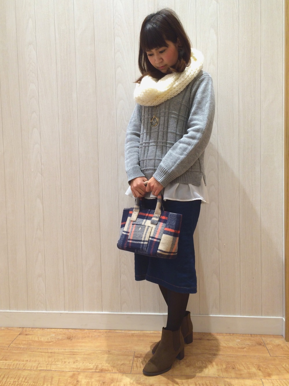 チエのニット/セーター「◆ラメチェックフリルニットプルオーバー」を使ったコーディネート