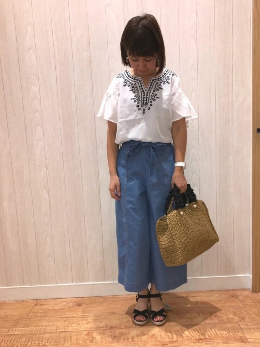 おはようございます* トレンドの刺繍ブラウスが 入荷しました♩ 買うの我慢してたんですが 着たらやっぱり欲しくなってしまいました。 合わせてるスカンツは以前あったものと似てますが 生地が夏仕様に薄くなって 丈も少しだけ短くなりました!🍉 この薄いブルーが夏っぽくて可愛いです♡