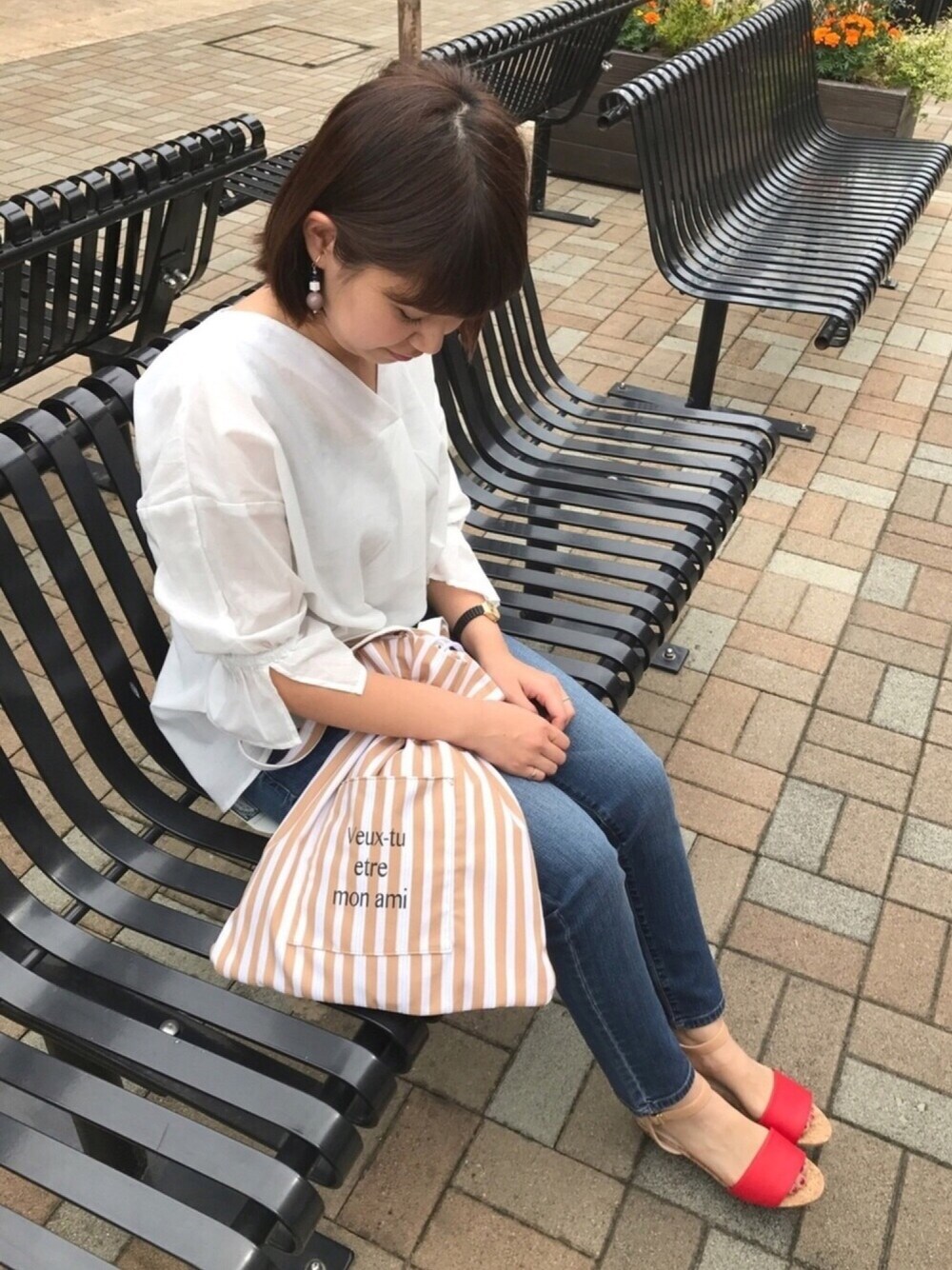 こんにちは* 可愛い巾着のバッグが入荷したので そちらをメインに大人カジュアルコーデに👖♡ バッグはキューティーブロンドのもので¥3229です。 ベージュ、レッド、ブルーの3色展開で 他のカラーも可愛いです☺️💕 サンダルも赤がポイントになって可愛く、 ヒールも低く履き心地良かったです👡✨