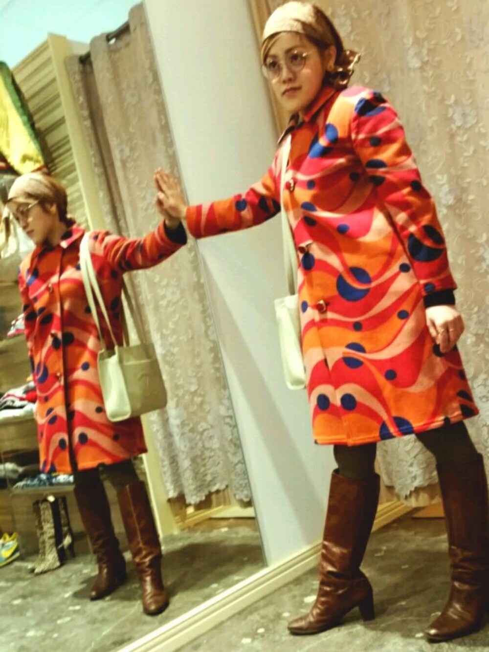 60年代、ツィギー風。 カラフルコートに、大きめなイヤリング。