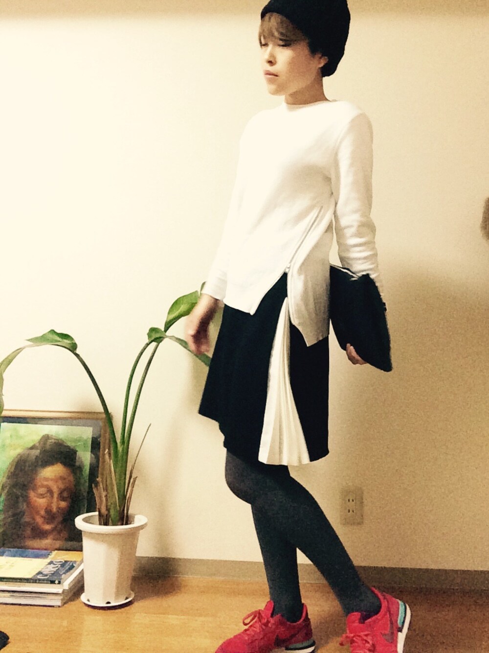 サイドがプリーツになったスカートに、あえて真っ赤なスニーカーを合わせて☆