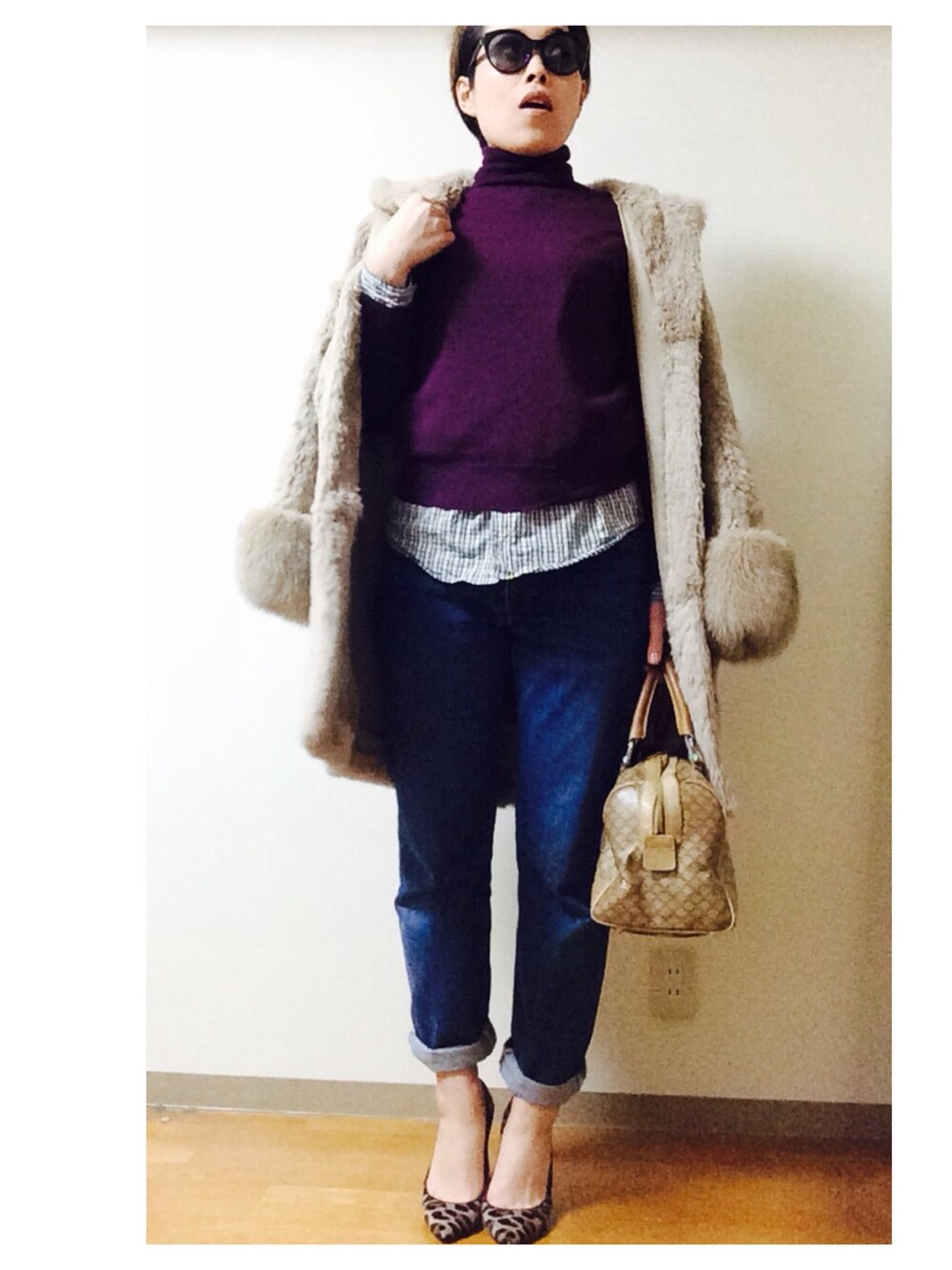 ラビットファーのコートも、ベージュカラーならトレンチ感覚☆シャツの上にタートルセーターを合わせてラフなレイヤードが完成!