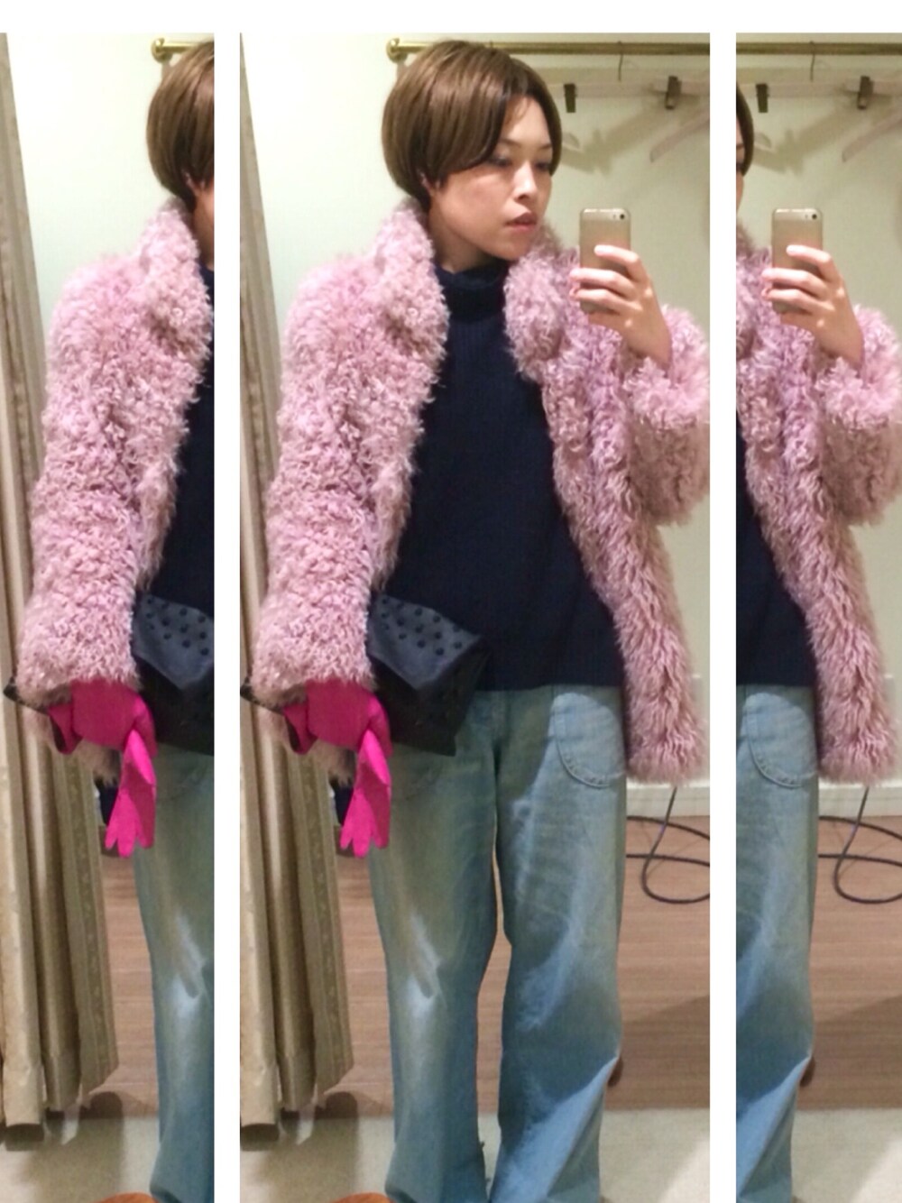 ”70's innocent girl” おもちゃみたいなピンクカラーのラムファーコートには、あえてボリュームたっぷりなデニムワイドパンツを合わせて…