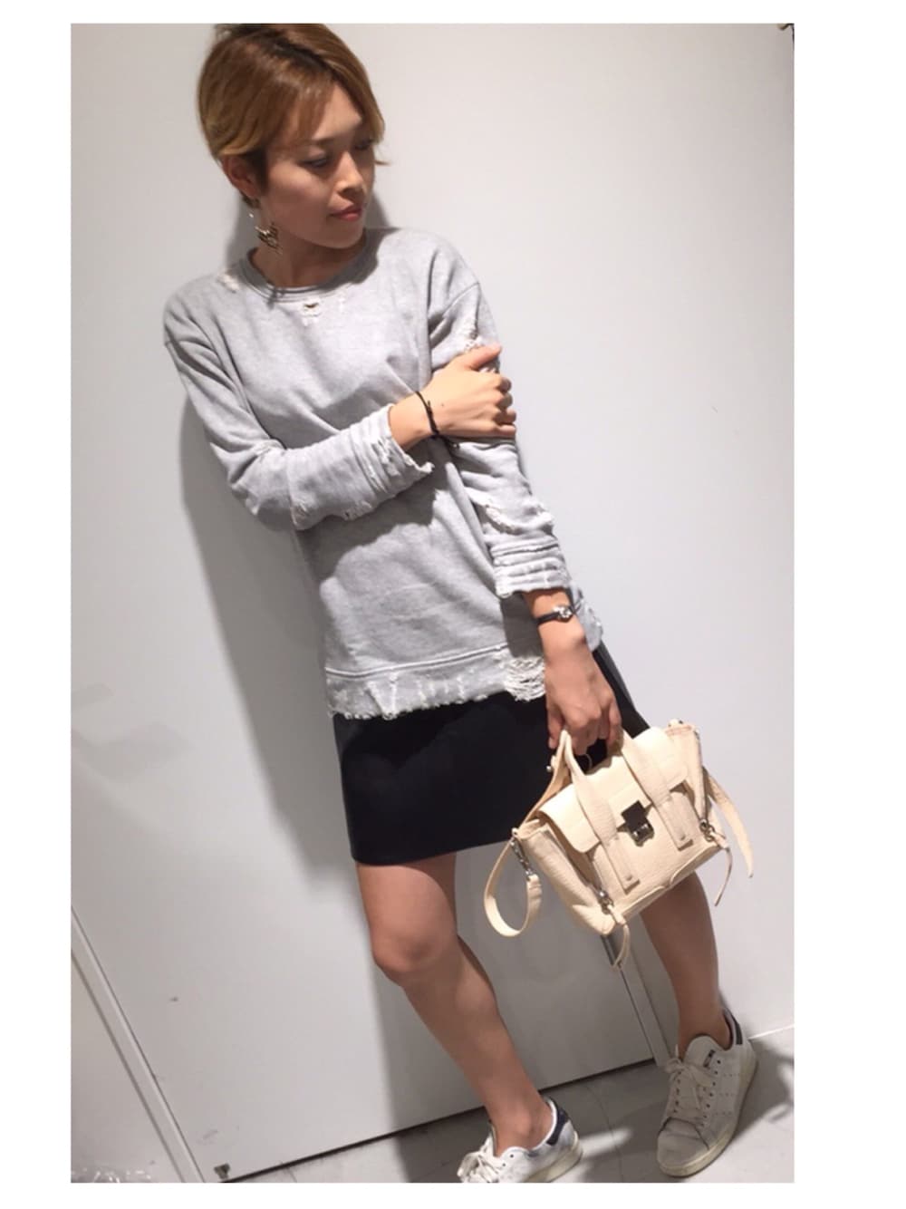 クラッシュ加工のスウェットにレザースカートを合わせて💕