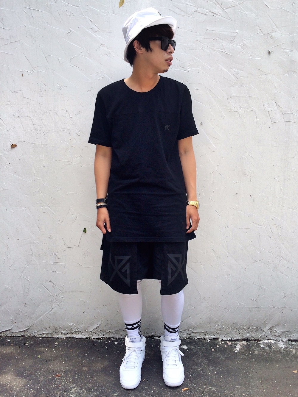 用類暗黑系單品,長版&褲裙,嘗試與白內搭運動白襪作結合,比例顏色拿捏恰到好處,漁夫帽更增添了休閒感,風格Mix才能擁有自我風格!