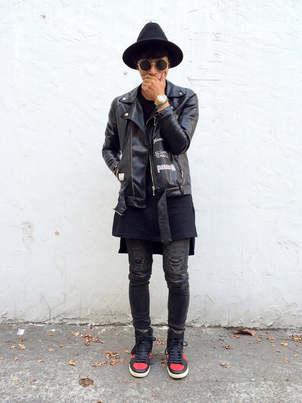 以紅黑配色球鞋在ㄧ至全黑貫穿的整體下,作衝突性視覺效果,上衣長版tee打造全身尺寸跳脫感。
