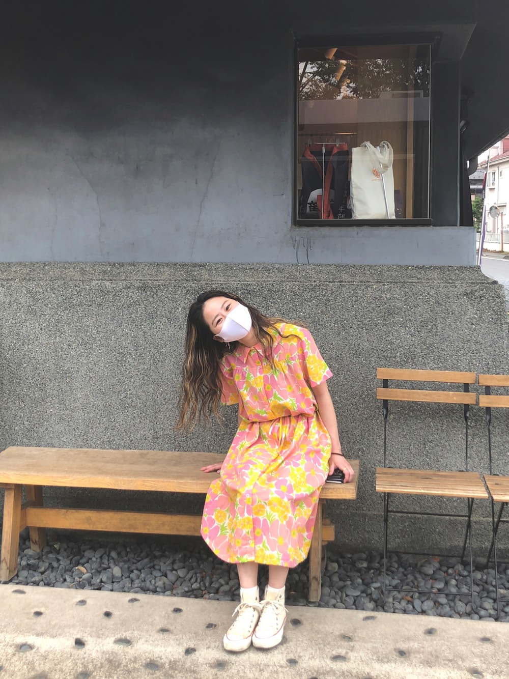 オレンジ系のワンピース、ベージュ系のスニーカーを着用したレディースの冬コーディネートの1枚目の写真