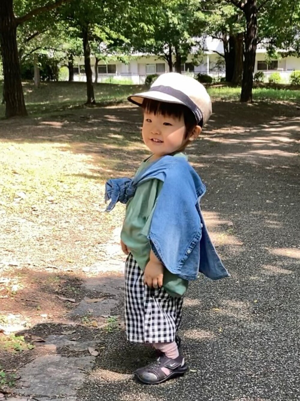 おはようございます😊 #ハーフパンツ ギンガムチェックとデニムのたすき掛けコーデです😌🤍🖤 見て下さりありがとうございます😽🤲 いいね、お気に入り、フォルダinいつもありがとうございます😌🫶 1歳10ヶ月男の子🚜