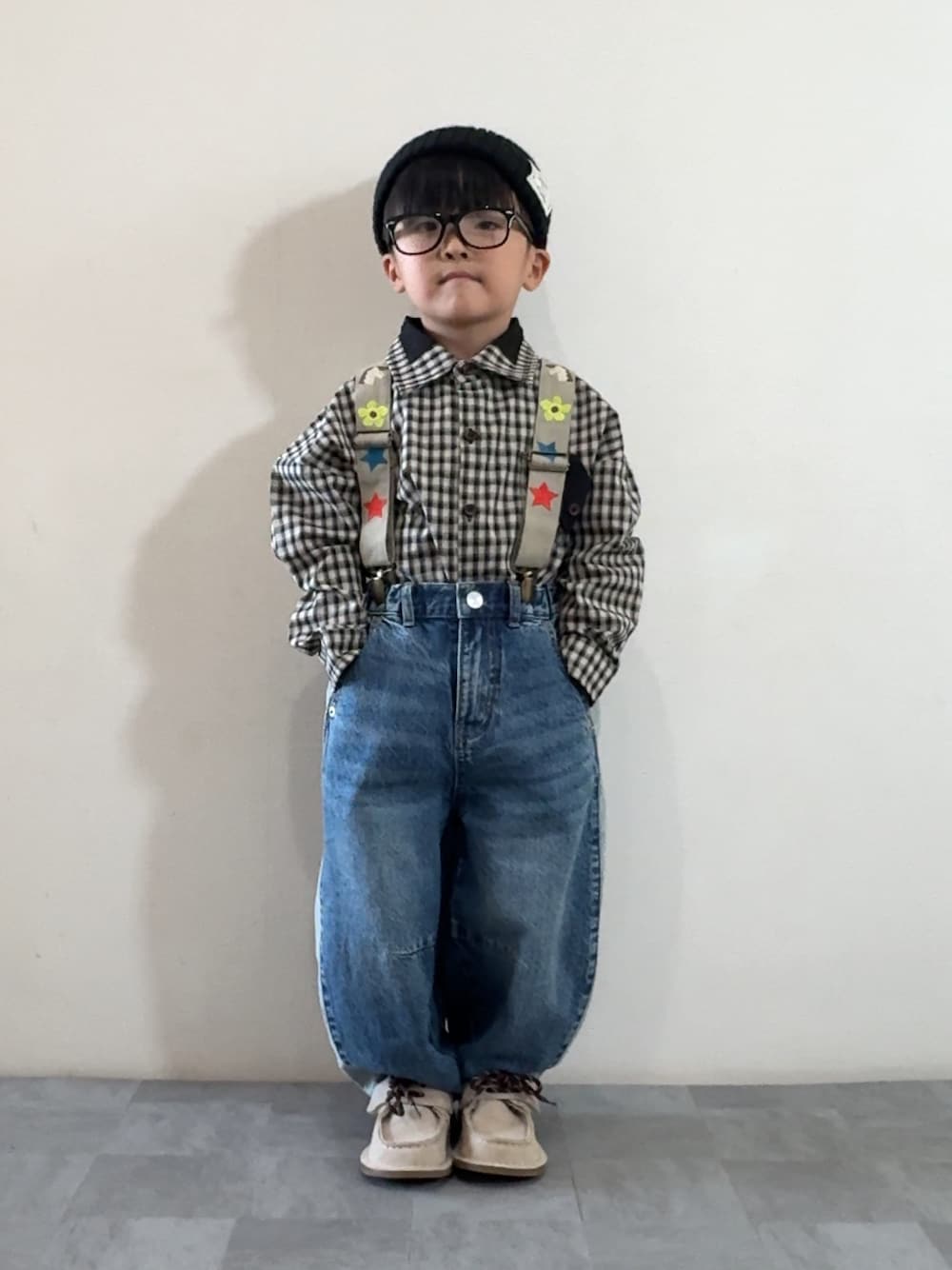 ▶︎newアイテム riziereのチェックシャツ👔 デザイン性のあるチェックシャツにサスペンダーを合わせて遊び心いっぱいの秋コーデ🤎 見て下さりありがとうございます♡ いいね、お気に入り、フォルダイン、フォローありがとうございます✏︎ *・・*:.。..。.:*・*:.。. .。.:*・゜゚・* 5y2m 104cm 16kg☺︎