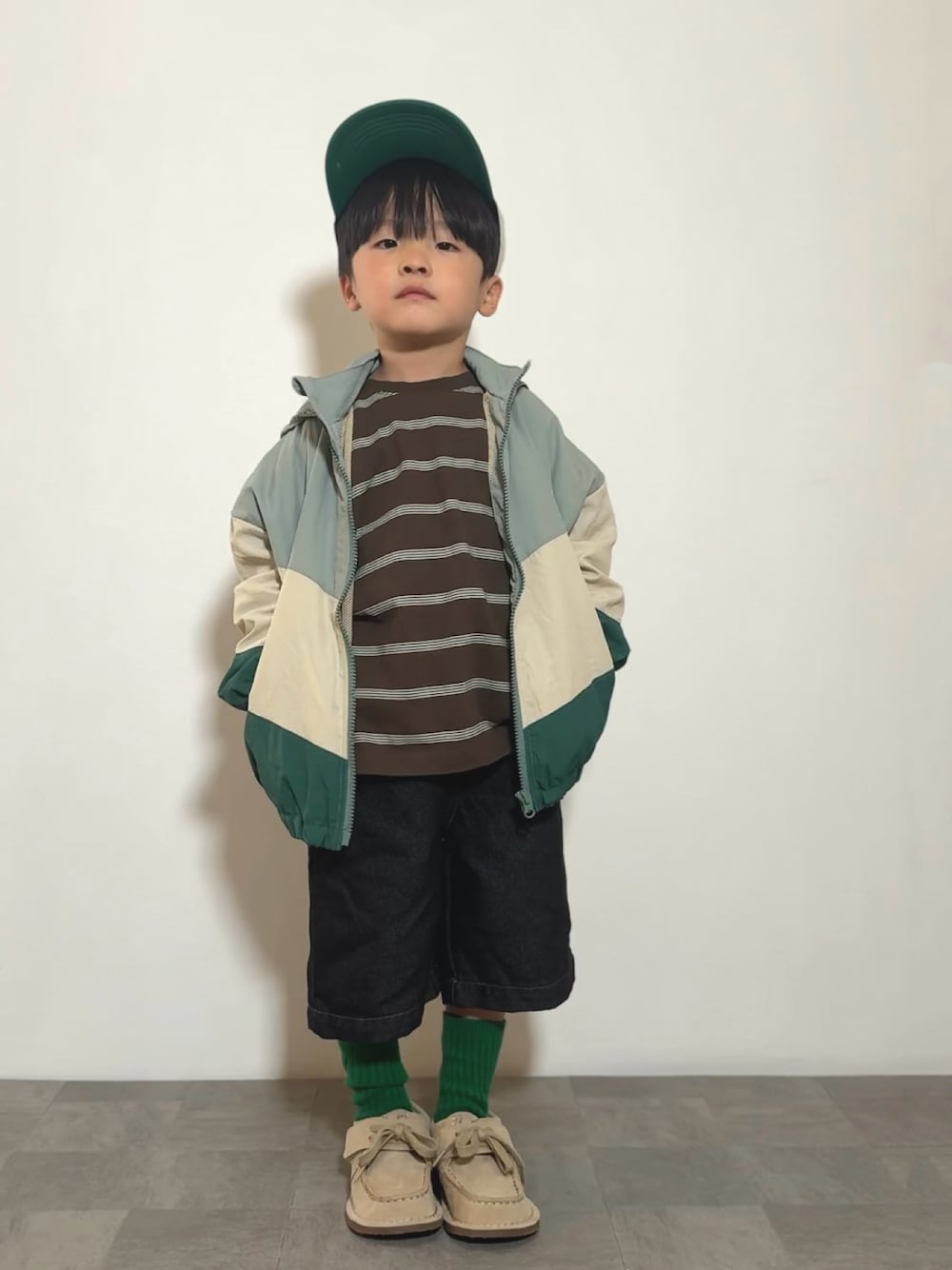 YU⭐︎のナイロンジャケット「【ジュニア対応】フードがしまえるマルチカラーウィンドブレーカー」を使ったコーディネート
