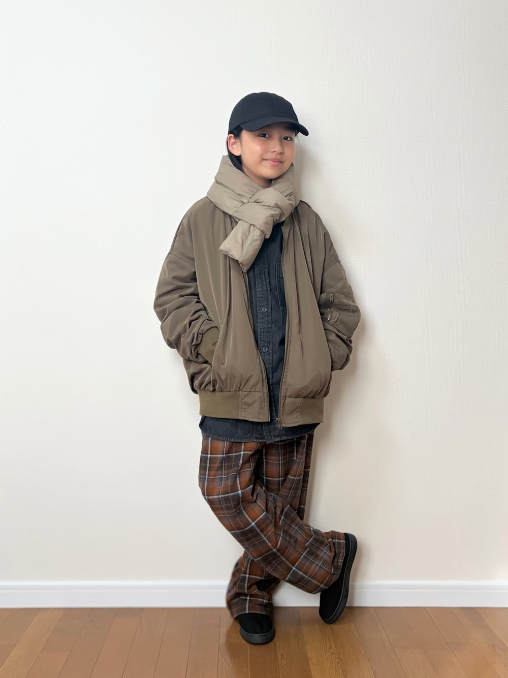 ▶︎UNIQLO UVカットツイルキャップ 09 BLACK/男女兼用 ヒートテックライニングパデッドマフラー 32/BEIGE デニムオーバーシャツ 09 BLACK/男女兼用S(大人サイズ) ▶︎green label relaxing TJオンブレチェック ネルパンツ/キッズ オレンジ/160cm ▶︎AAA+ スニーカー ▶︎MA-1