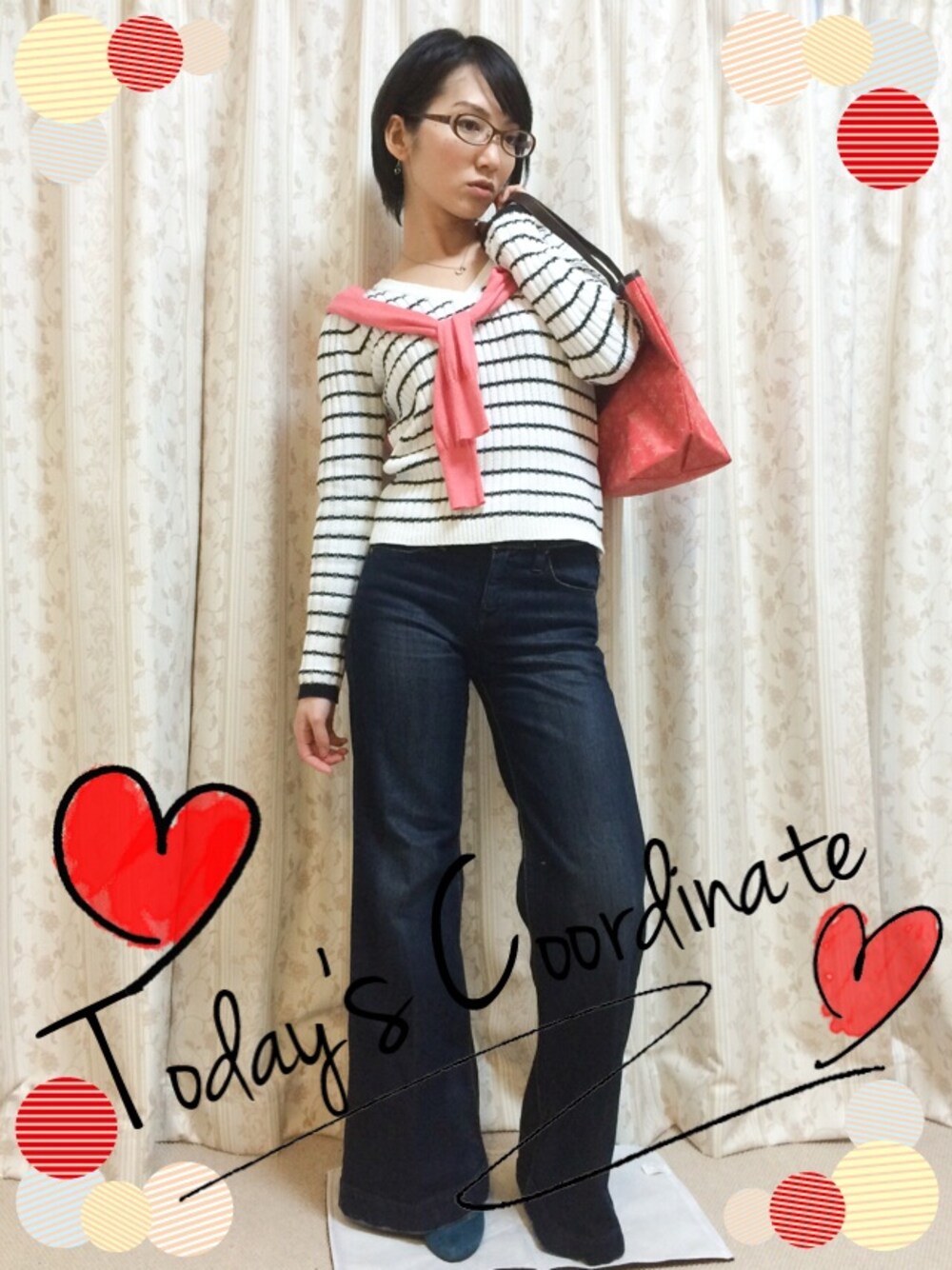 何年も前のUNIQLOのデニムワイドパンツ。久々にはきました。楽チン♪サーモンピンクをポイントにマリンっぽく(*^^*)