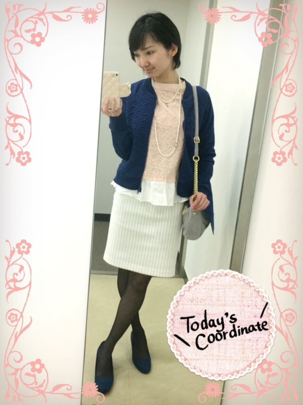 色を合わせてみた、ネイビーのブルゾン、パンプス、バッグ。カジュアル過ぎるのは好きじゃないので、中はきれい目に。この他にレザーブルゾンとストールも持ってたけど、今日の気温なら無しで大丈夫でしたね☆