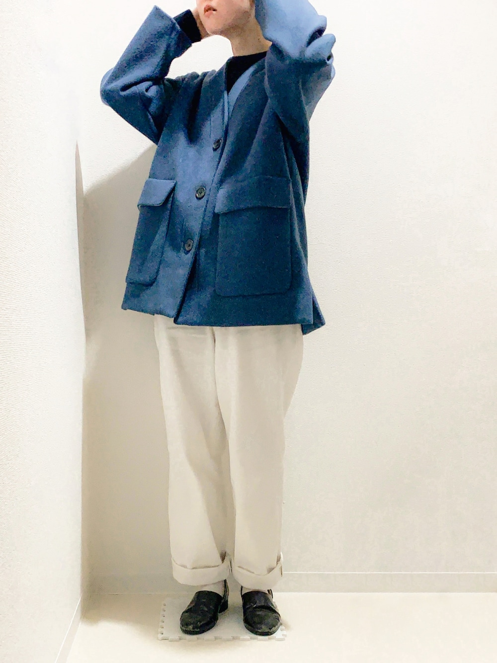 冬の日です 青いコートをメインにきれいめカジュアルにまとめました