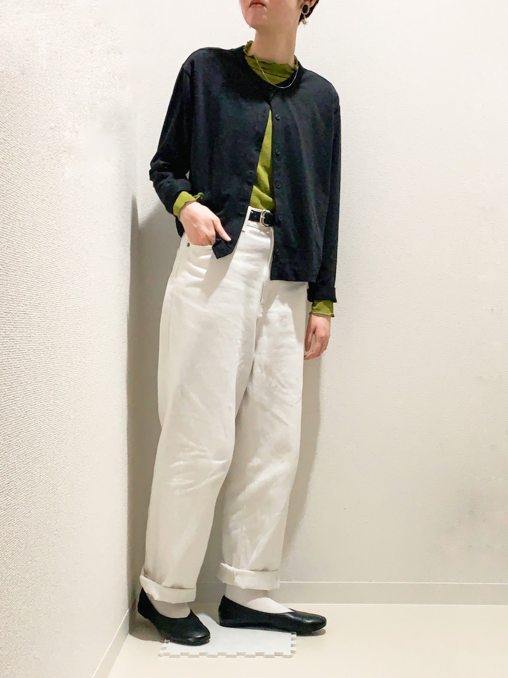 シアートップスで重ね着コーデ。 トップスの色味が重めなので、白デニムで爽やかさを出しました。