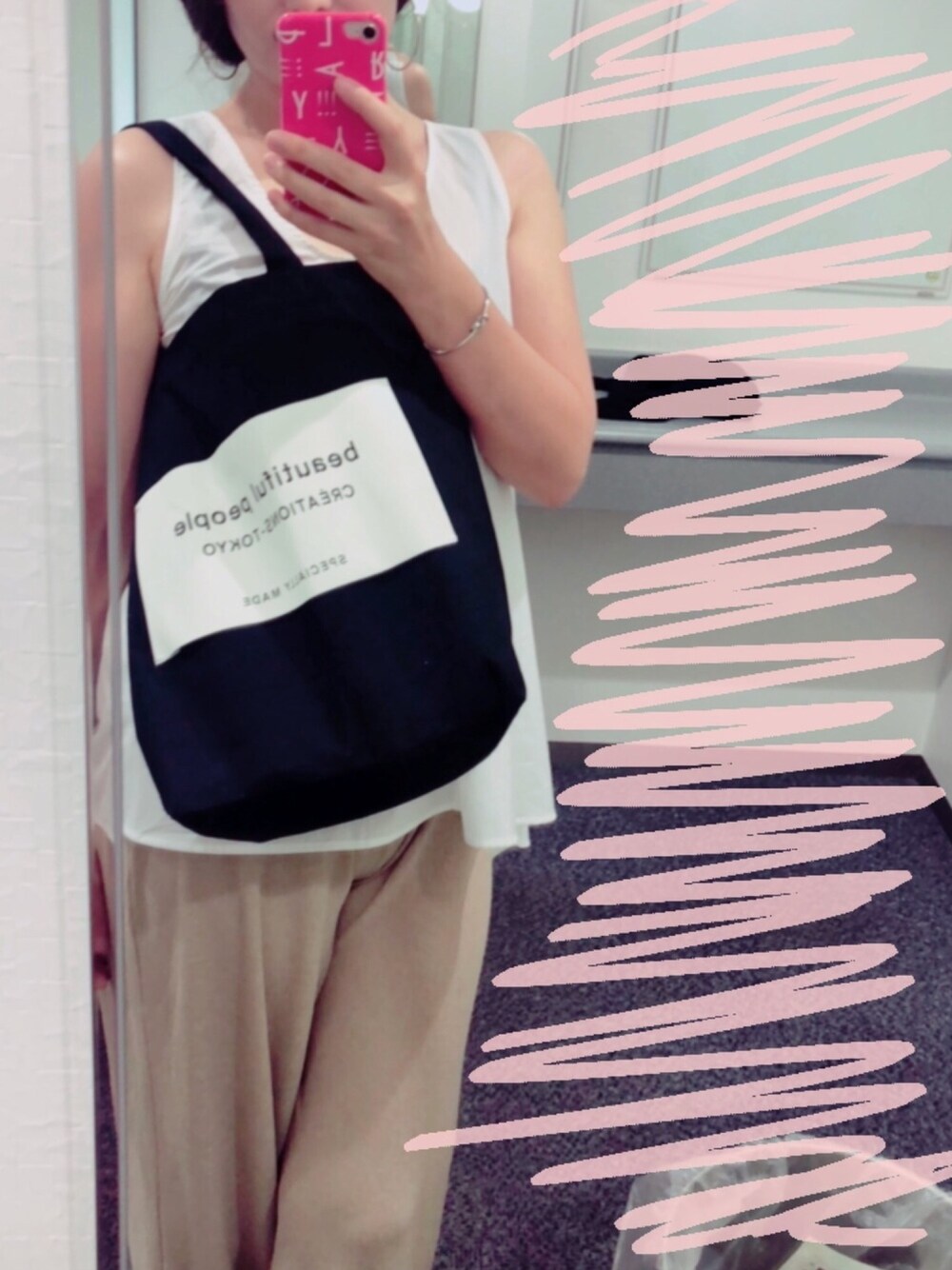 お気に入りのbeautiful peopleのネームトート♡ トップスはアシンメトリーでインナーにもなるし、使いやすい♡ 楽チンコーデ