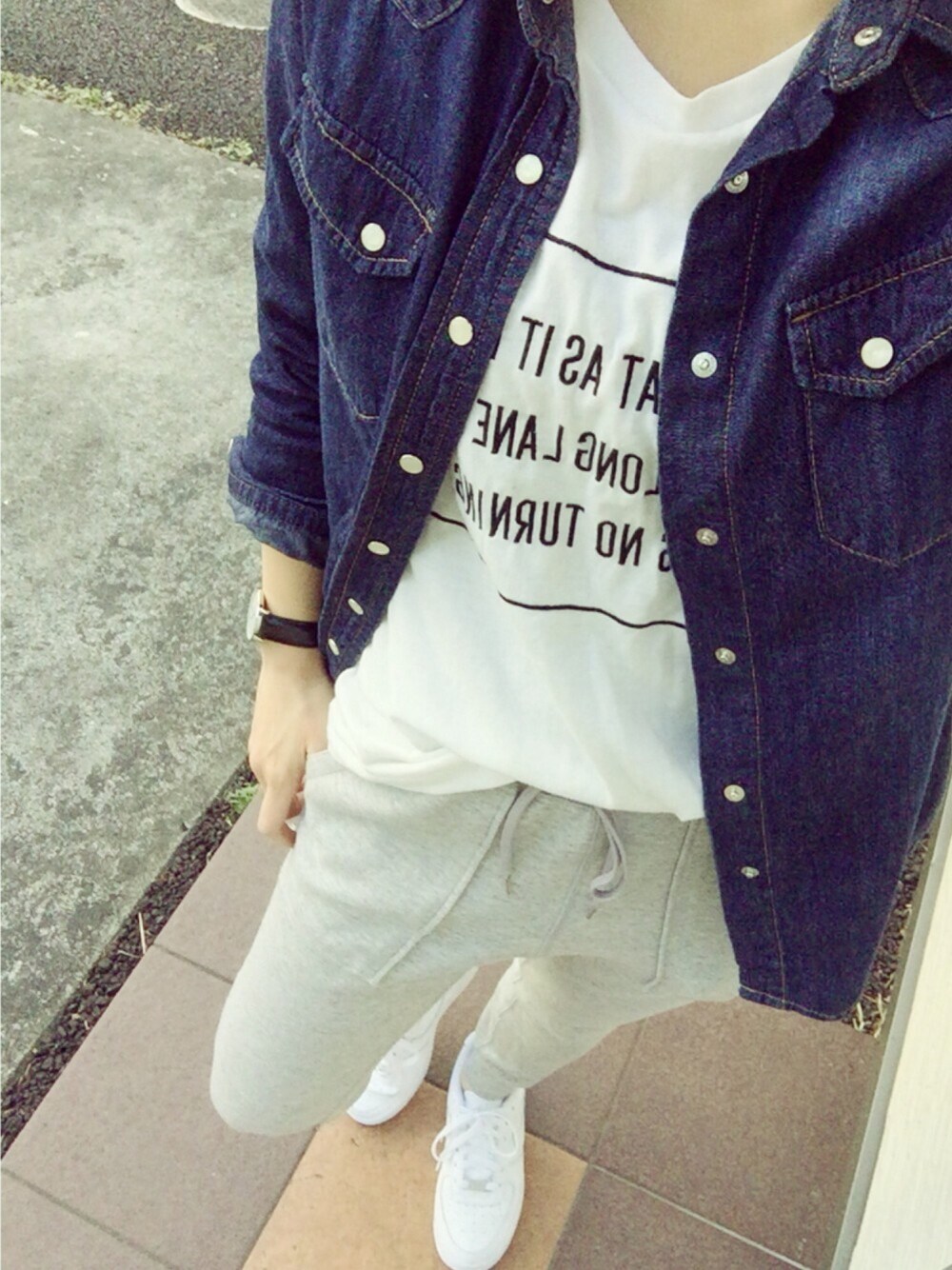 今日はあったかいからデニムシャツだけでお出かけ♫ guのスエットパンツ動きやすい😆❤️ 白のエアフォースワンはお気に入り😍😍😍