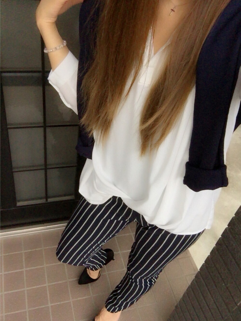 今日はホワイト✖️ネイビーコーデ💕 キレイめシャツとストライプのボトムでちょっと出来る女風😏✨笑 最近恐ろしいことに気づいたちいたろ!😳 車の保険約1年切れたままだった😭⚡️ 事故らんで本当よかったー😂😂😂 今日お休みだったから早急に保険契約しました🙇 全然出来ない女ですね...💔