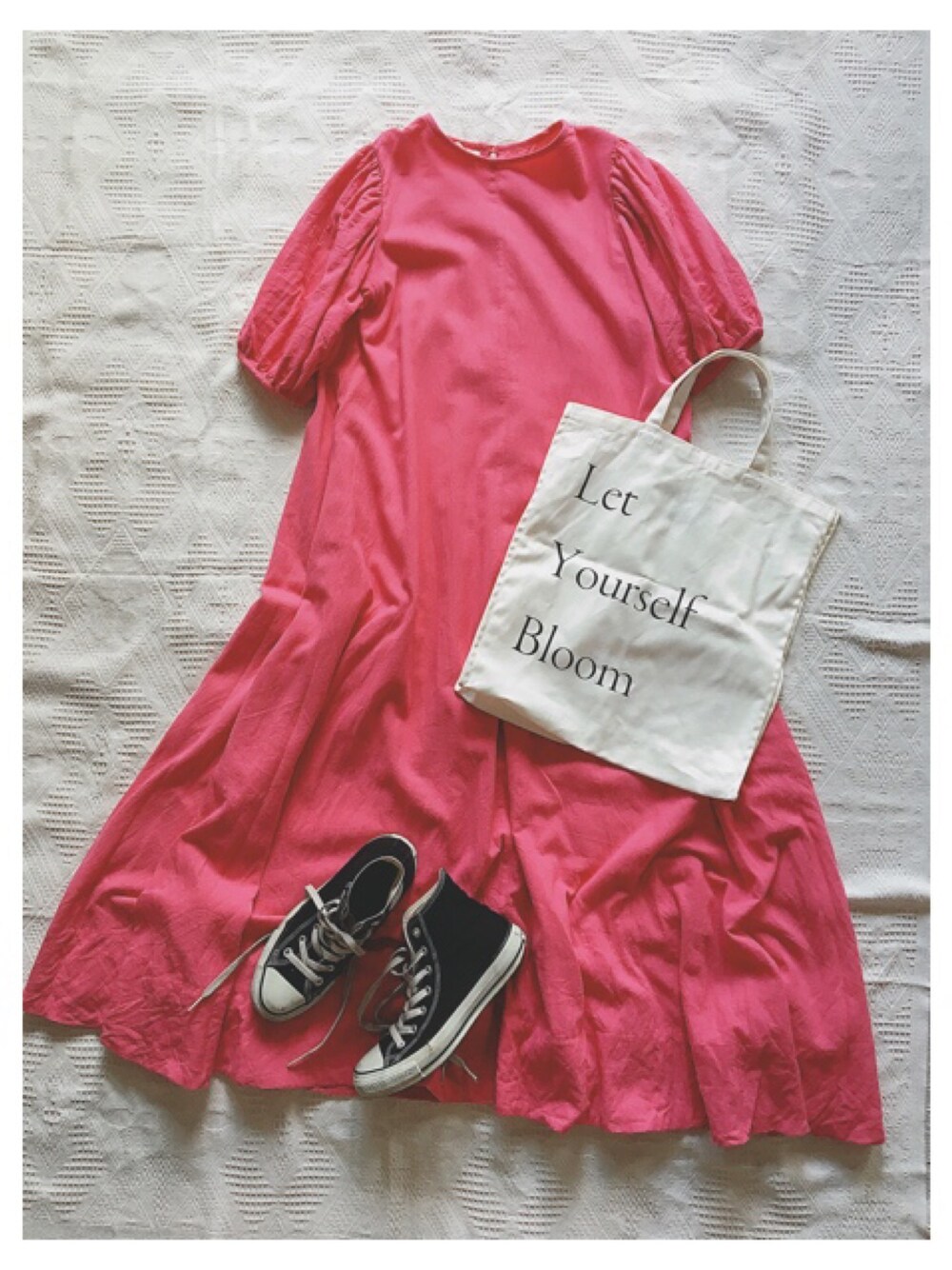 再販で買えたtadoのSARA DRESS、メキシカンピンク可愛いいいい‥ 土曜日は天気良かったし一枚着でぴったりでした。