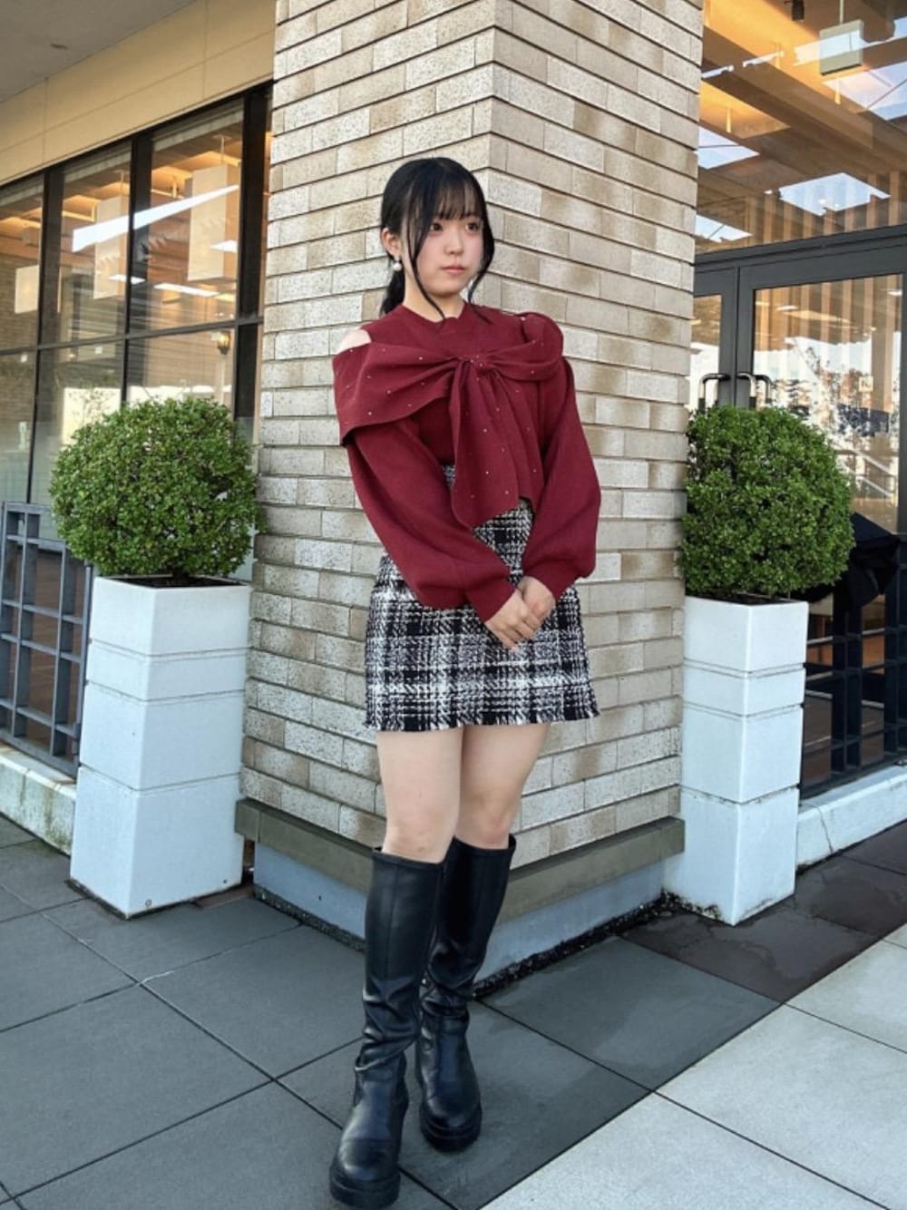 ❤️×🖤 ボルドーのリボンニットが主役の大人っぽかわいいXmasコーデ🎄🎅 なんと言っても胸元のリボンがポイント🎀!! キラキラビジューが冬に映えます✨ 肩あきでちらっと肌見せあざとデートコーデに🫶🏻 コートを合わせたらあったかカワイイ&ブラックで引き締まってスタイルup⤴︎⤴︎⤴︎