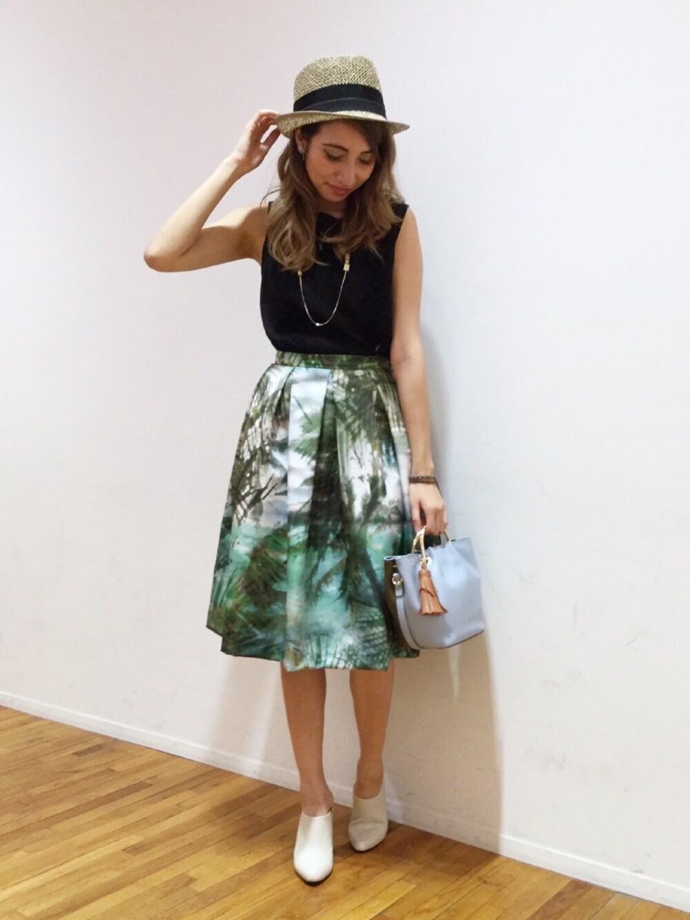 グリーンの柄スカートにブラックの トップスで合わせて大人っぽコーデ するのがわたしの中でマイブームです♡ バッグも前と後ろで色違いでショルダーにもなって凄く可愛い😳