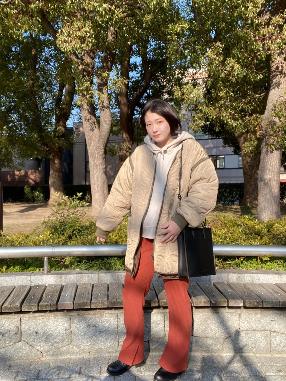 またまたniko and…のジャケット. 実はリバーシブルなんだ~🦘⇄🦖 これにオレンジのセンタープレスを合わせたのがポイント🍊 ジャケットを脱いでも可愛い. 小物は黒じゃなくても良いかもね.
