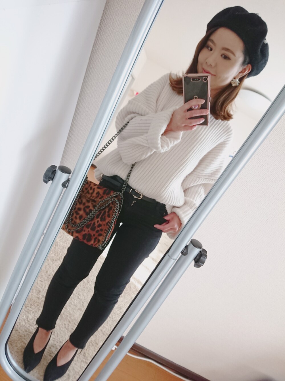ともだちとおでかけコーデ♪ ボリューム白ニット+黒スキニーでシンプルモノトーン。 レオパードのバッグとビジューピアスでスパイス❤️
