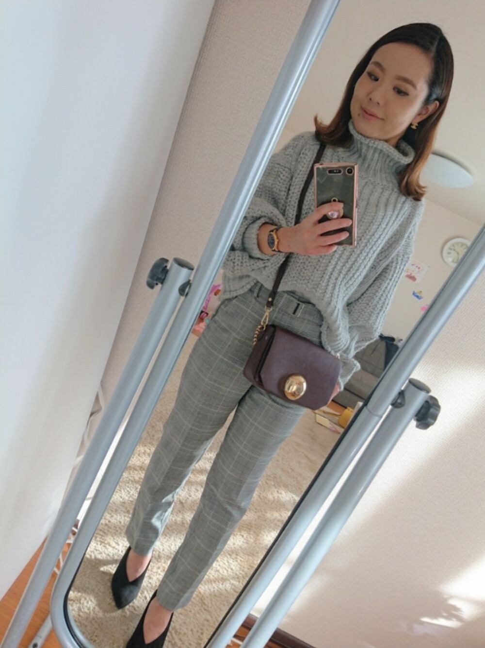 グレーのワントーンコーデ♪ H&Mのニットはハイネックの形が絶妙で、お気に入り😍 バーガンディのbagが差し色になって大人女子❤️✨