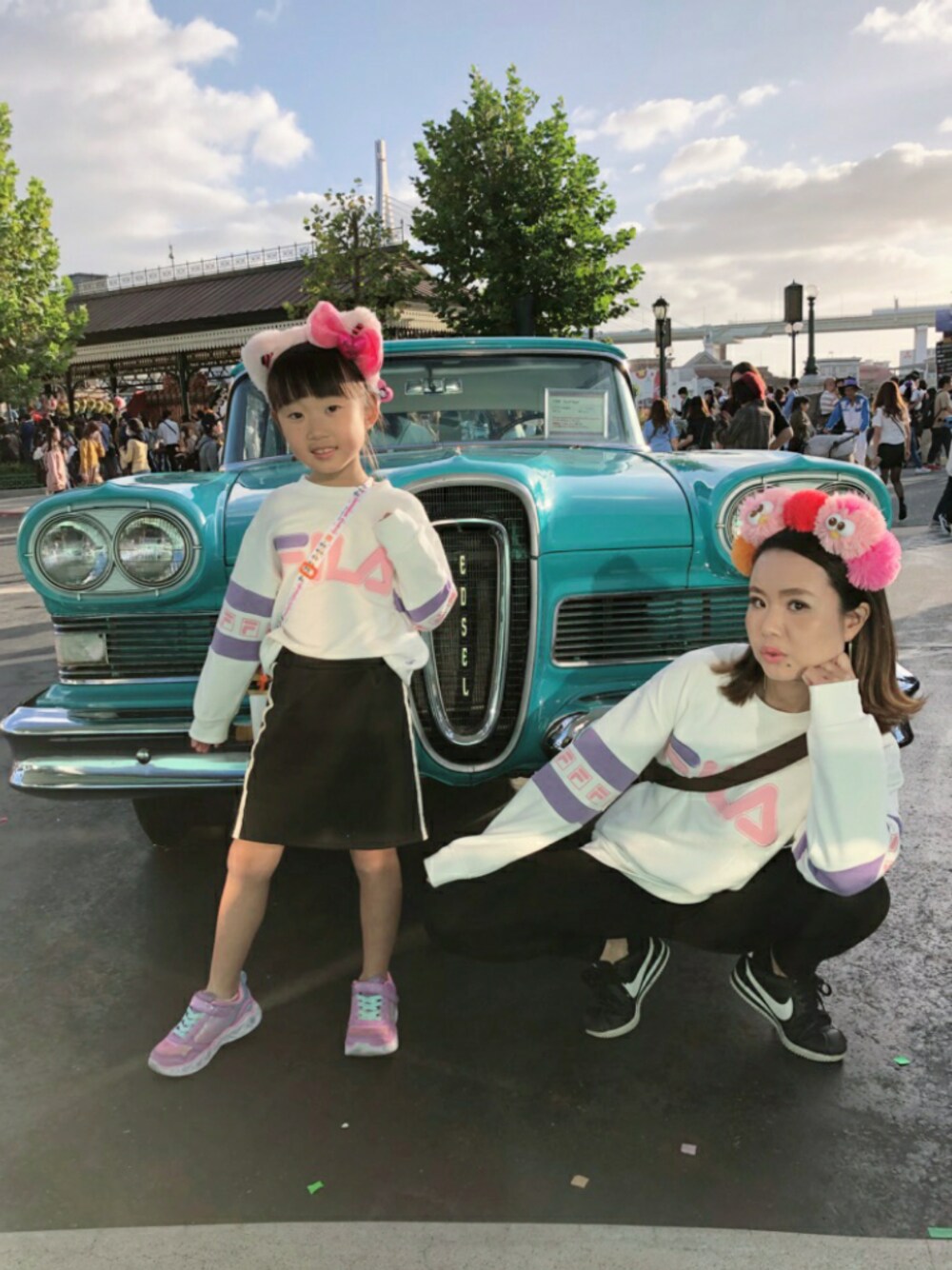 USJ行ってきました(*^^*) なんと奇跡の晴れ☀️✨✨ 持ってるね~😆😆😆 FILAのスウェット×ラインボトムで親子リンクしました☺️ ちなみに私のスウェットはキッズの160センチです♪