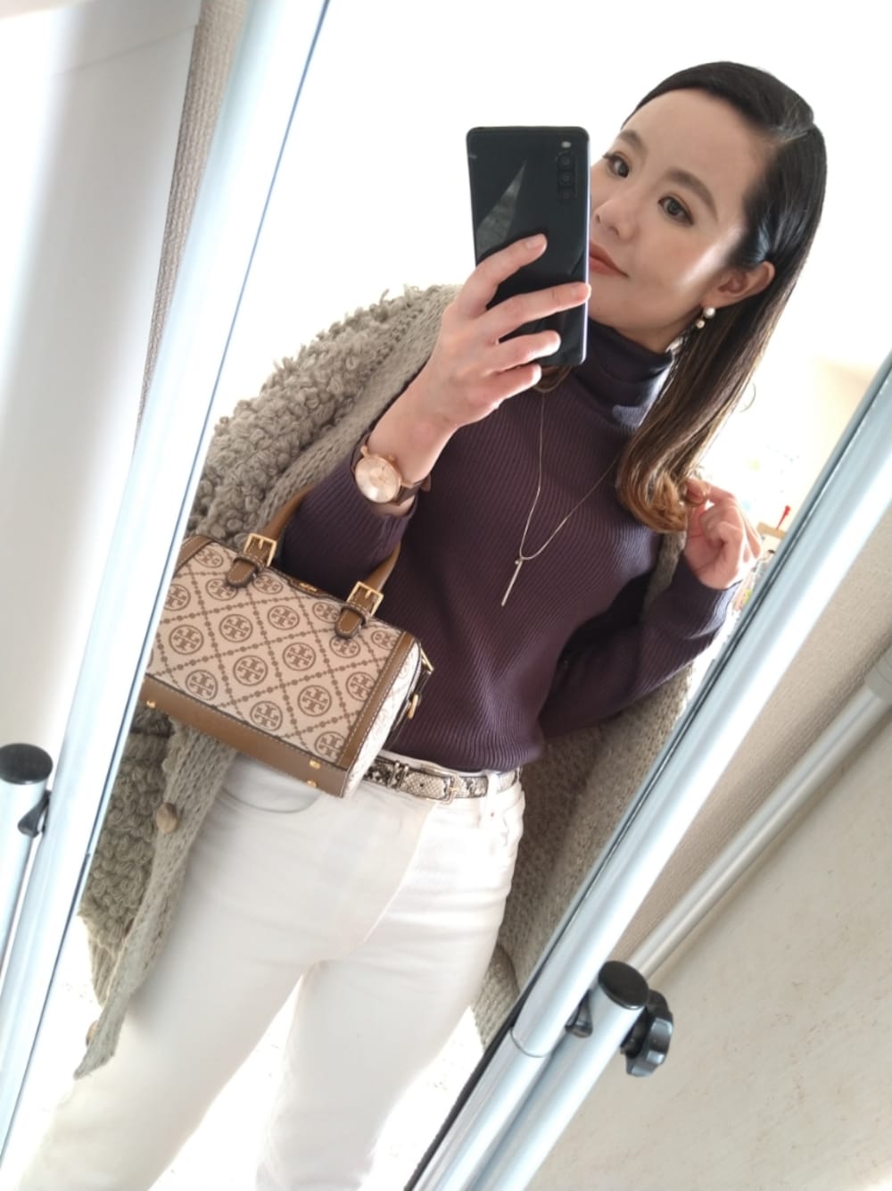 ママ友とランチコーデ(◍•ᴗ•◍)✧*。 シンプルなハイネックニットとパンツに、去年購入して一回も着てなかったプードルニットカーデを合わせました♡ 羽織るだけで華やかになるプードルニットは、今年はたくさん着よう♪ ポイントはGUのパイソン柄のベルトです✨