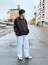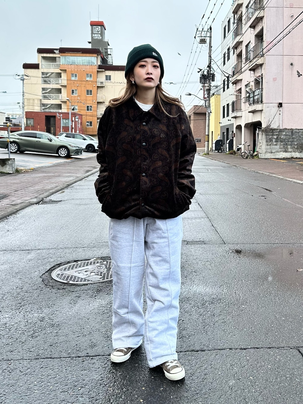 ペイズリージャケットを主役にスウェットパンツでラフにスタイリングしました。 ジャケットはあえて前を閉めて、裾のドローコードを絞るとジャケットが引き立ちオススメです!!!