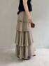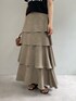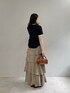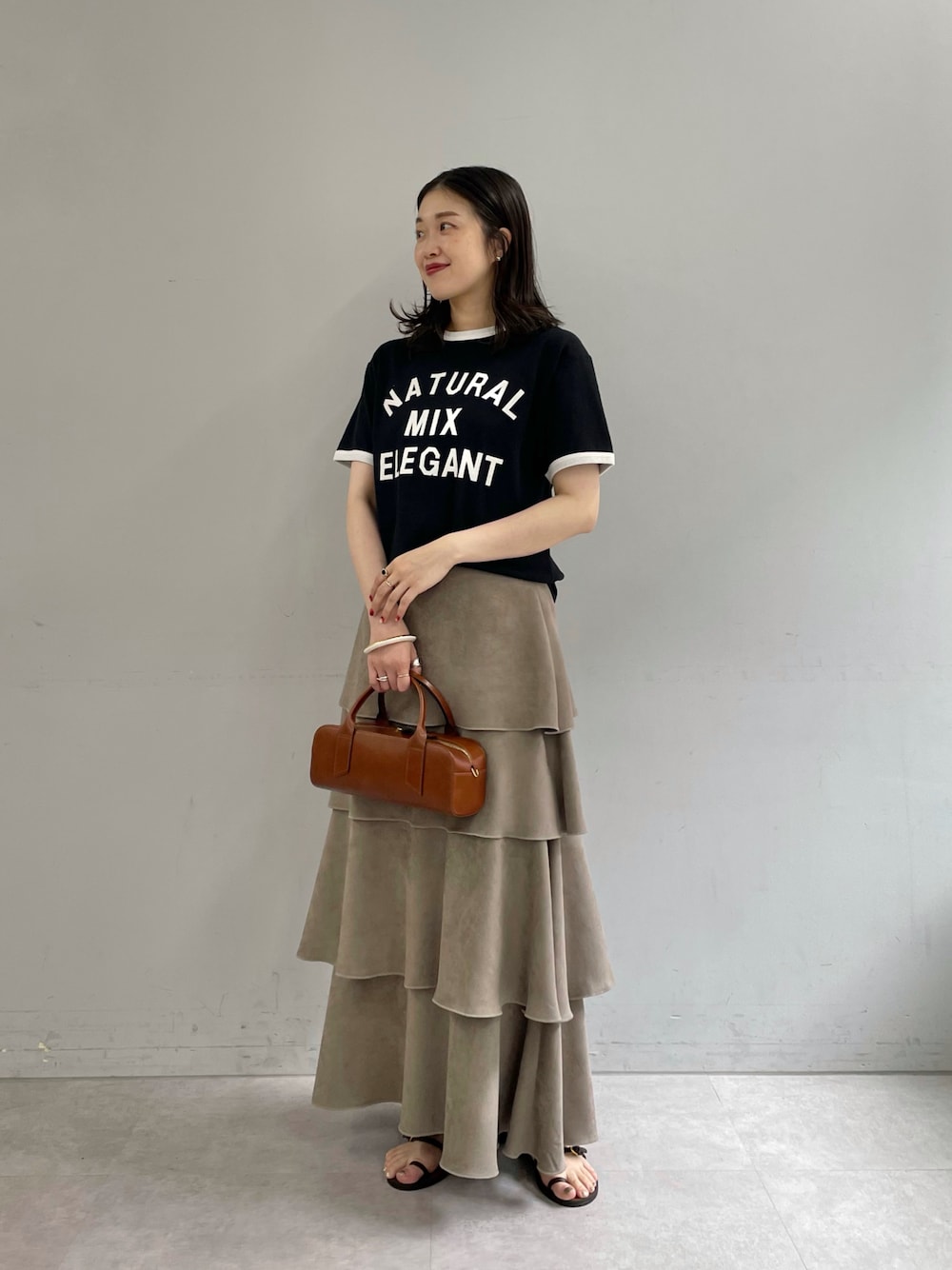 【トップス】着用サイズ / フリー 程よくゆとりがあるサイズ感。 柔らかな質感で、着心地がとても良いです。 ロゴはプリントではなく、フェルトが縫い付けられたものになっており、Tシャツ1枚でも存在感があります。 そのまま着るも良しですが、ジャケットやスカートなど、キレイめアイテムの外しとしての合わせ方が特にオススメです。 【スカート】着用サイズ / 38 とても柔らかくて履き心地の良いスカート。 着丈は長めですが、 スエード風で素材がポリエステルなので軽く、 ストレスなく履くことができます。 サイドにフリルが寄っており、横からのシルエットもキレイなので、 360°どこから見ても華やかな雰囲気になります。