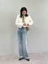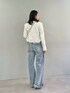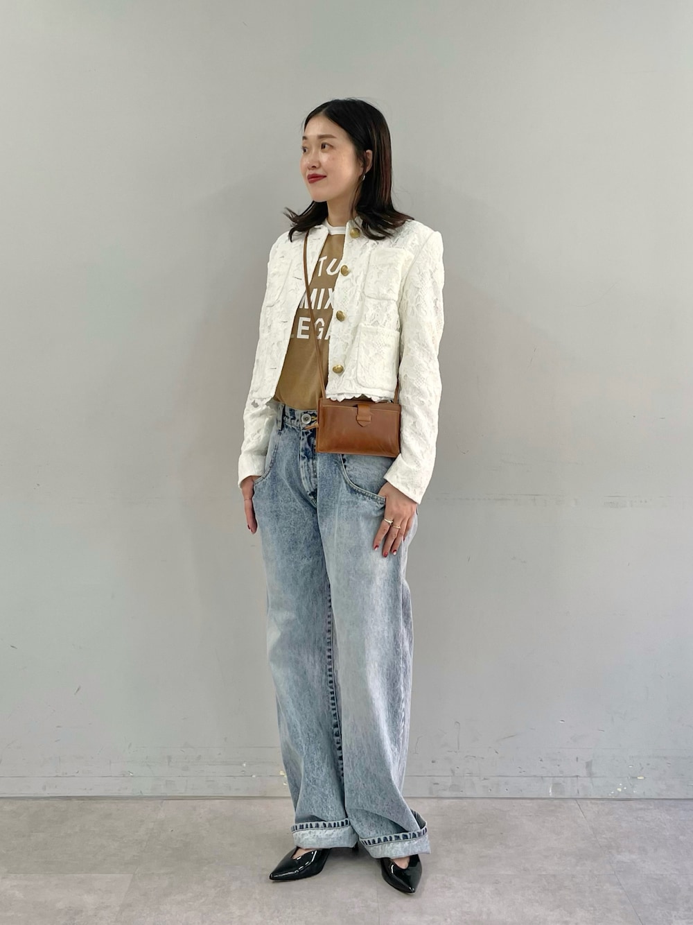 【ジャケット】着用サイズ / フリーサイズ 総レースで華やかな印象のジャケット。 コンパクトなシルエットや金ボタンのおかげで、 どんなボトムと合わせても女性らしくまとまります。 1枚お持ちだと、 普段使いからお呼ばれシーンまで幅広く使えて便利ですよ。 【Tシャツ】着用サイズ / フリーサイズ 程よくゆとりがあるサイズ感。 柔らかな質感で、着心地がとても良いです。 ロゴはプリントではなく、 フェルトが縫い付けられたものになっており、 Tシャツ1枚でも存在感があります。 そのまま着るも良しですが、ジャケットやスカートなど、 キレイめアイテムの外しとしての合わせ方が特にオススメです。 【パンツ】着用サイズ / 38サイズ 大人が履けるローライズジーンズ。 立体的なポケットデザインが特徴的です。 このデザインがあるおかげで、 気になる腰回りがうまくカバーされている気がします。 個人的にローライズボトムはスタイルアップが難しいと感じあまり手が出せないのですが、 こちらのデニムはある程度の太さがあるので、 ヒールと合わせるととてもスタイルが良く見える!と感動しました...! デニムが好きな大人女性にぜひ履いていただきたいです。