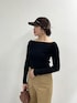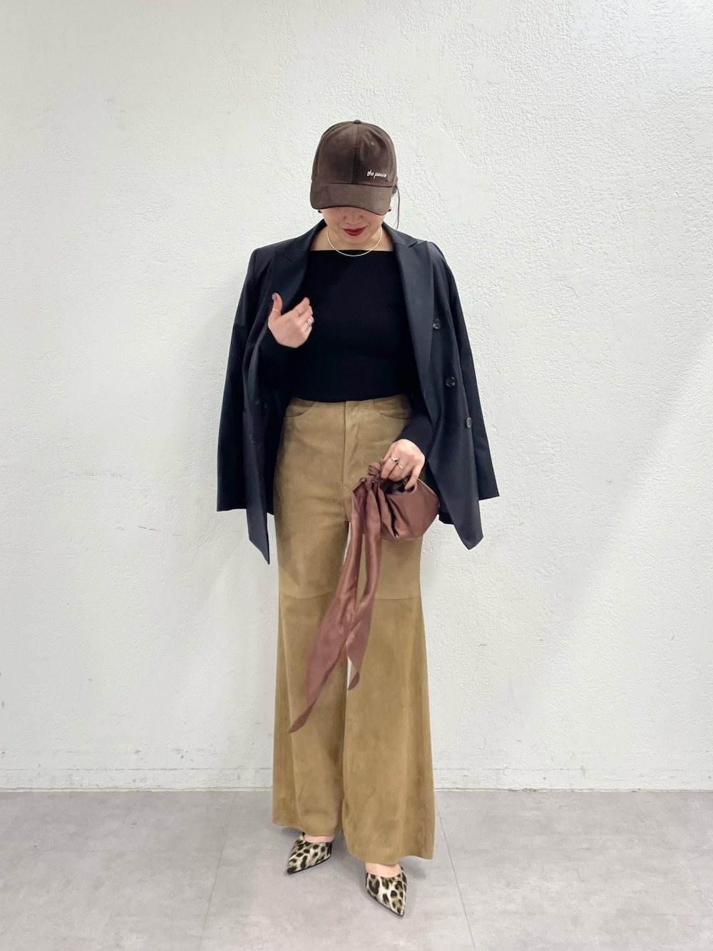 【ジャケット】着用サイズ / サンプルサイズ ハンサムな印象になるピークドラペルダブルジャケット。程よくゆとりがあり、着るだけでこなれた印象になります。 着丈は長め。シンプルなデザインなので、カジュアルにもキレイめにも、どちらにも合わせられます。 【インナー】着用サイズ / フリーサイズ ボートネックとしても、オフショルダーとしても使える2way仕様のニット。ミラノリブなので肌あたりも良く、素材的に春や秋に使いやすいタイプです。 ニットなのでストレッチがしっかり効いておりますが、私の体型にとっては細身に感じました。1枚で着るには勇気がいるので、インナーに使ったり、サスペンダーのパンツに合わせるなどすると着やすそう。スタイリングに取り入れるだけで、女性らしさが生まれるアイテムです。 【パンツ】着用サイズ / フリーサイズ やぎ革が使用されたスエードパンツ。柔らかいので、履き心地はバツグンです。肉付きの良い私の腰回りでも、キツく感じませんでした。 切り替えがひざ上になっているので、履くだけでもスタイルアップが叶います。パンツでしっかりとスタイリングの表情が生まれるので、シャツやジャケットのようなスタンダードなアイテムと合わせて履きたいと思いました。 【パンプス】着用サイズ / 36サイズ 普段22.5〜23.0cmを履いている自分にとっては、少し余裕があるサイズ感でした。アンクルストラップでしっかり固定されるとフィット感があり、足のところに余りがあっても気にならないなと感じました。 程よい高さのヒール、アンクルストラップのおかげで、かなり履きやすいパンプスです。