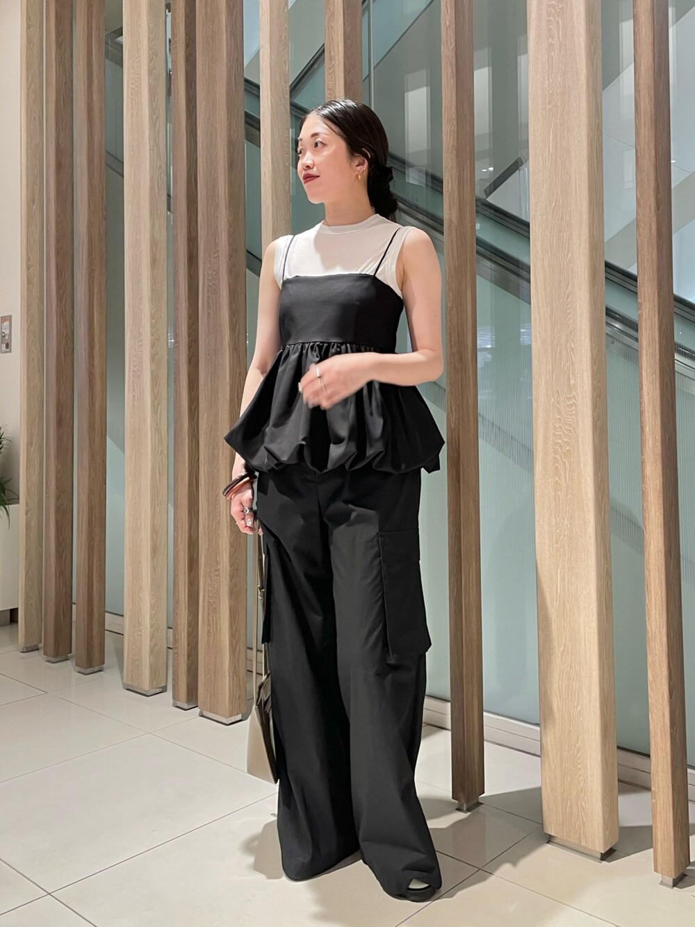 【キャミソール】着用サイズ / フリーサイズ 裾のバルーンシルエットがかわいい1枚。ボリュームはありますが、肩紐が細く胸元の切り替え位置が高めなので、バランスよく着られます。背中部分がシャーリングデザインなので、フィット感はありますが締め付け感はなく、ストレスフリー。インナーは薄手のものがオススメです。 【パンツ】着用サイズ / 38サイズ ボリューム感があるカーゴパンツはスタイリングのポイントになります。似たようなデザインのものを私物で持っていますが、シンプルなTシャツでもサマになるので、かなりヘビロテしておりました。 軽い履き心地で、暑い時期でも履きたいと手が伸びます。サイズ感はゆったりめ。私でも36サイズでちょうどよく履けます。少し艶が感じられるので、ブラックでも重く見せずに履くことができます◎ 【サンダル】着用サイズ / 36サイズ 普段22.5〜23.0cmを履いている私の足で、縦は結構余りあり、横幅はぴったりなので、横幅は細めだと感じます。私の足にとっては36サイズでも大きいのですが、アンクルストラップが付いていることと、かかと部分にホールド感があるおかげで、脱げることなく履けています。( リアルバイしました!) 硬そうに見えてとても柔らかな革なので、履き心地も良いです。素肌が見えにくいので、サンダルですが良い意味でサンダル感が強くなく、ラフになりすぎず、とても使いやすいです。