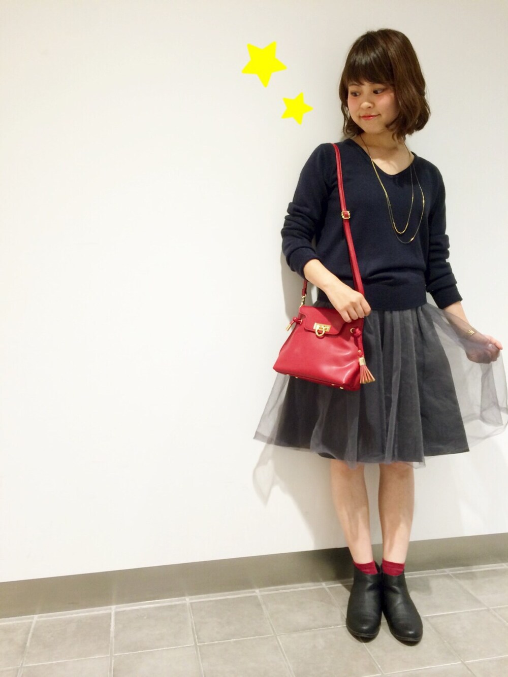 チャコールグレーのチュールスカート♡ ネイビーのこのニット超お買い得なのに使える👍👍 シンプル😭💕 差し色に靴下とバッグの赤👼💕