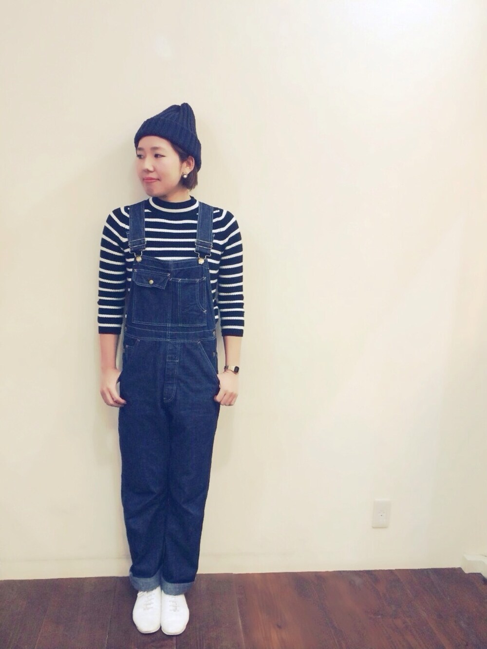 ニット帽/HIGHLAND2000 ボーダーニット/gu オーバーオール/GOWEST 靴/repetto