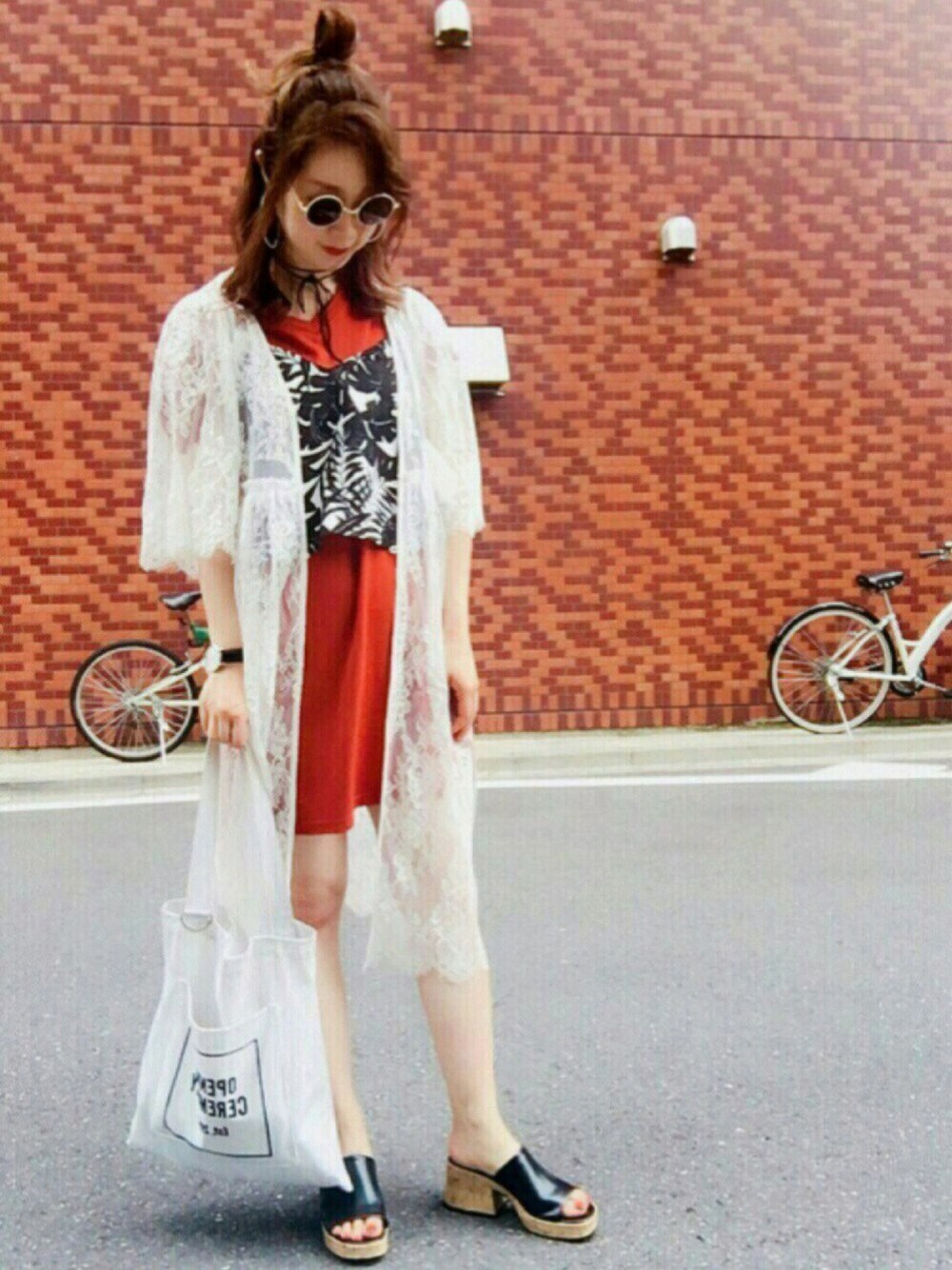 大好きなemodaのキャミにテラコッタのTシャツワンピとレースガウンをレイヤードしました☺︎全部お気に入りアイテムです♡ Instagram chiiie_____e