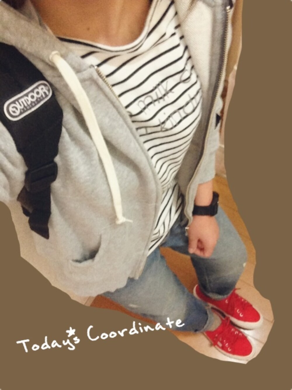 上から ボーダー:honeys パーカー:RFM ボーイフレンドデニム:忘れた スニーカー:SUPERGA 腕時計:adidas リュック:OUT DOOR バイトバイト🎶