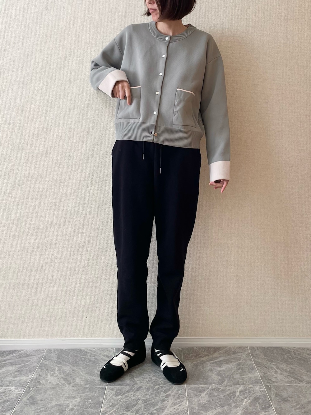 ちいのカーディガン/ボレロ「春の羽織りに!ゴールドボタン配色カラーニットカーディガン」を使ったコーディネート