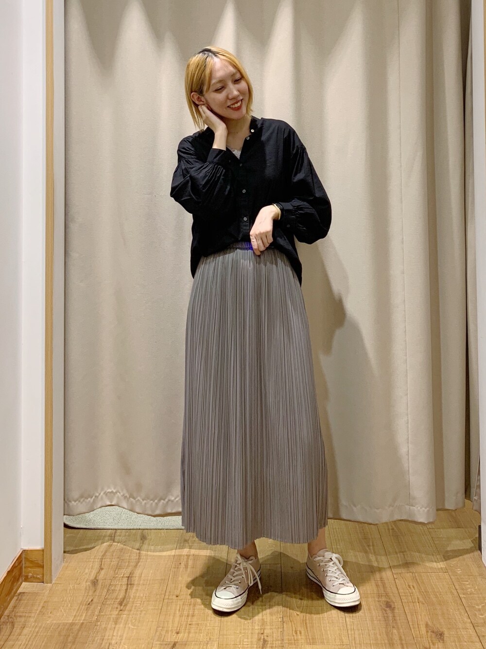 スニーカーでカジュアルダウンしました〜! さらっとしたシャツと、新作のカットプリーツスカートが相性よすぎる!!