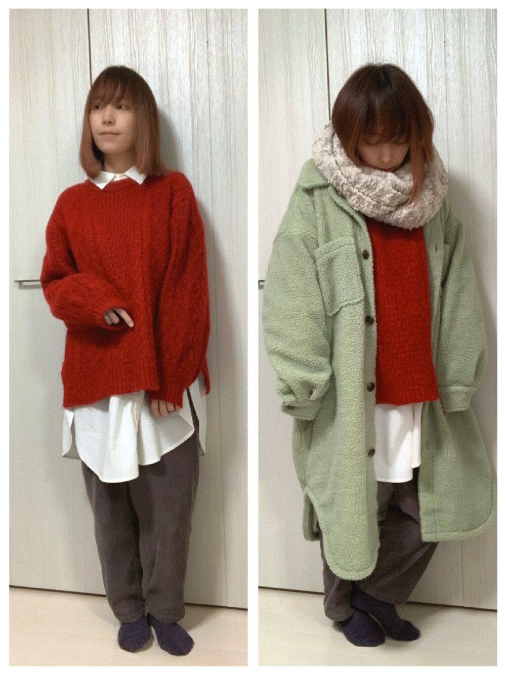 防寒バッチリコーデ! 雪予報だったので映えるように 赤ニットをチョイス! アルパカ混だからめっちゃあったか😀 コーデュロイのパンツで 脚もあったか!