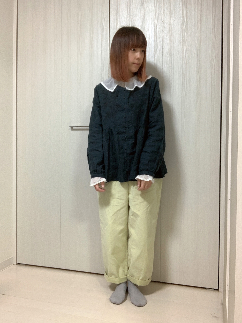 緑系統コーデです🌟 パンツは黄色なんですが、 淡い黄緑みたいでかわいい! 厚すぎないのでどんなコーデにも あわせやすい! あざみのブラウスはリネンで 気持ちいいです😆