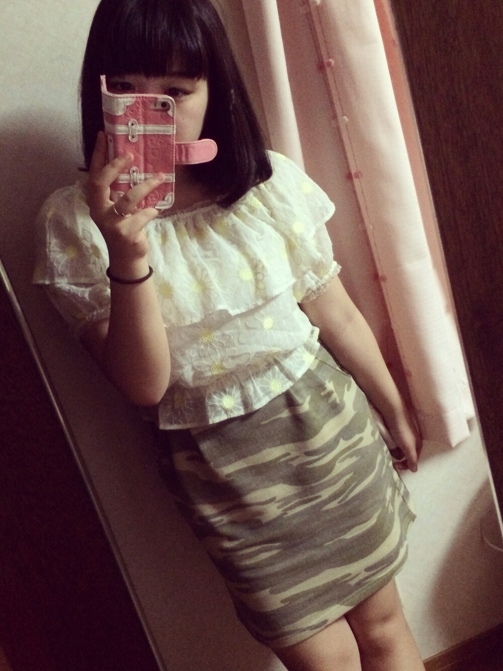 柄×柄は難しそうで敬遠してたけど お花の刺繍が迷彩をガーリーにしてくれて ほどよいミックスコーデになりました。 わーい😃