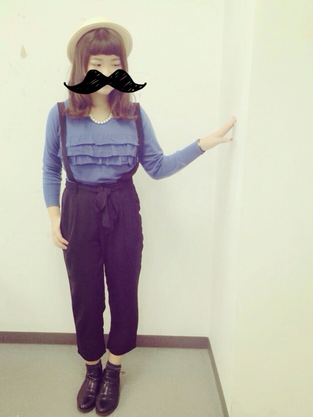 ニットが着れる季節になってうれしい。 ブルーを身に纏うと落ち着く。 セットアイテムのパンツだけを使いました。 フェルトのカンカン帽はdazzlin。